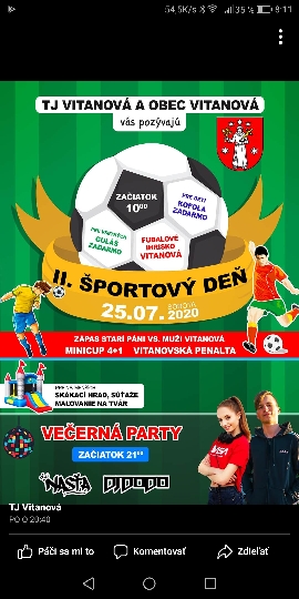TJ Vitanová a Obec Vitanová Vás srdečne pozývajú na II. ročník súťaže: „Športový deň“, ktorý sa uskutoční dňa 25.7.2020 (sobota) na futbalovom ihrisku vo Vitanovej.
