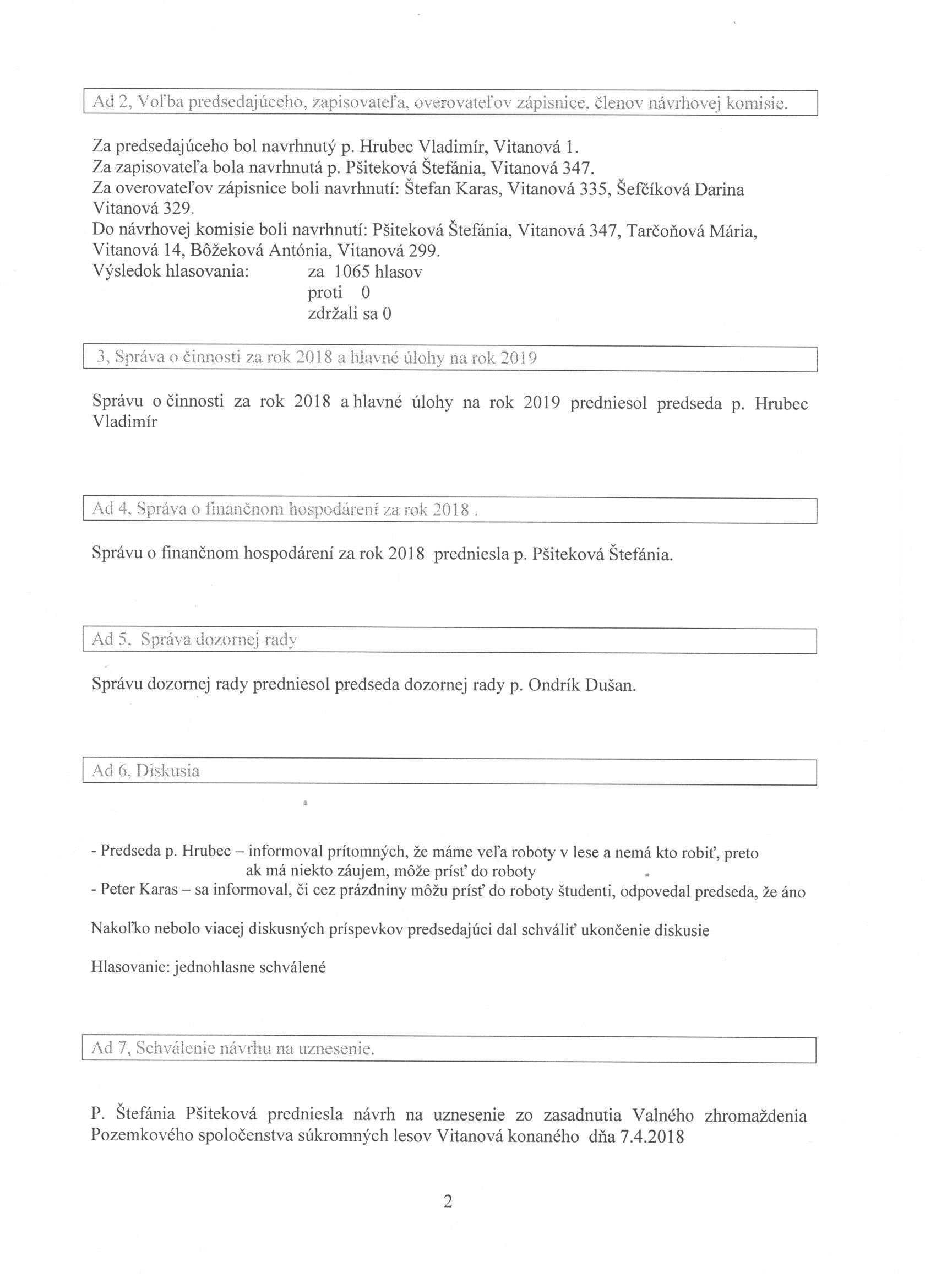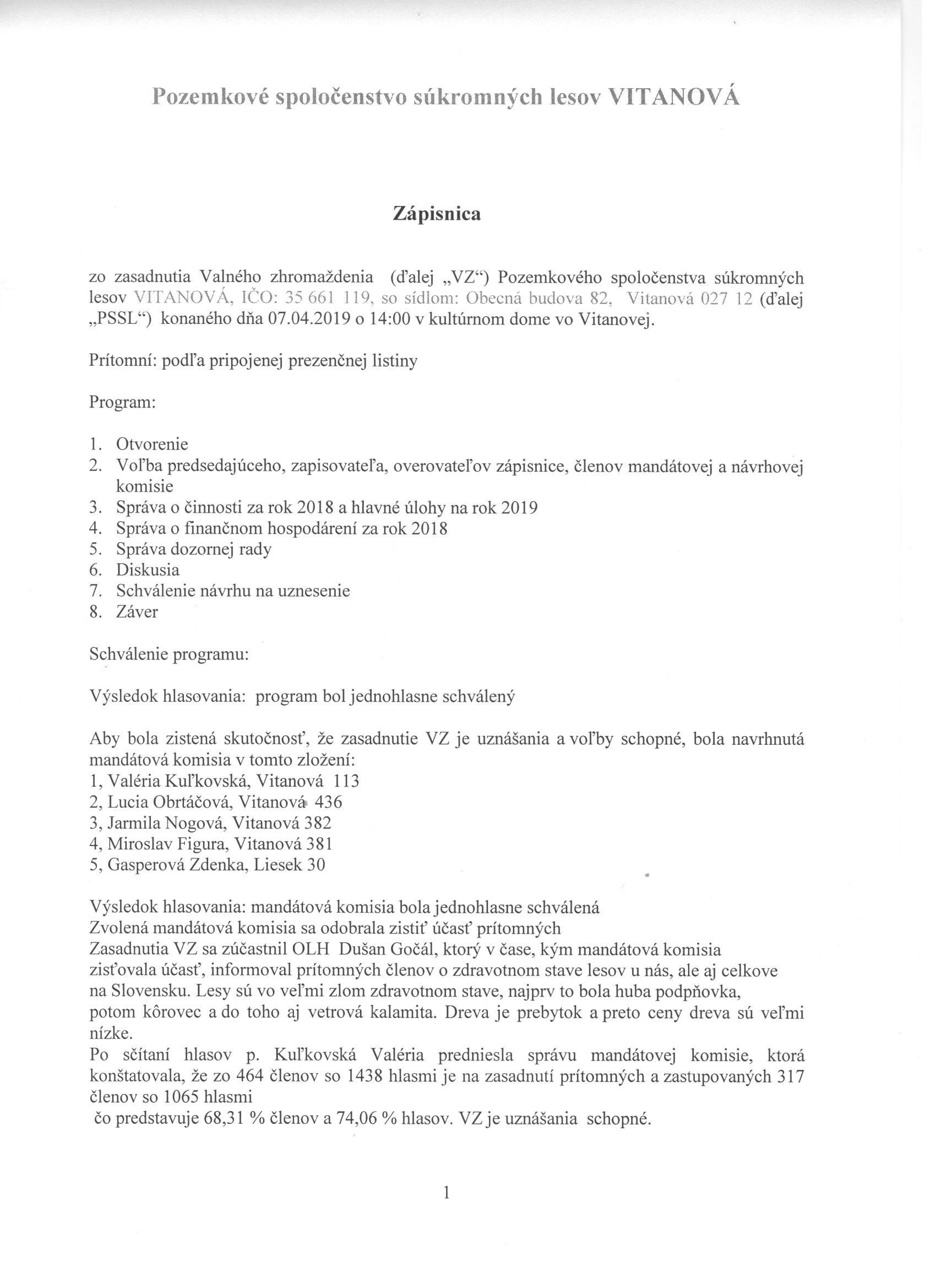 Zápisnica zo zasadnutia Valného zhromaždenia pozemkového spoločenstva súkromných lesov 2019