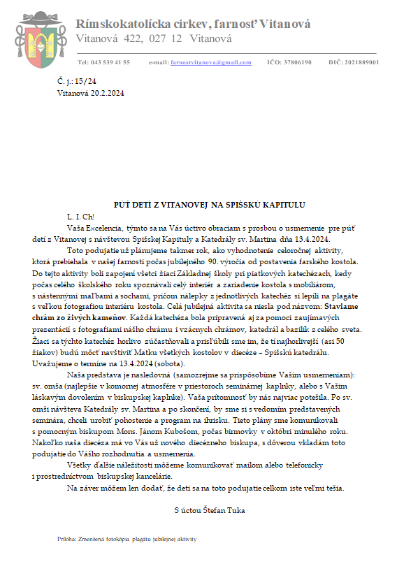 Z dôvodu denných kapacitných obmedzení spracovateľského centra krvi v Košiciach je počet odberov limitovaný, preto v prípade záujmu o darovanie je nevyhnutné vyplniť formulár, ktorý nájdete spolu s podrobnými informáciami o podujatí na web stránke Spišskej diecézy (https://kapitula.sk/kvapka_krvi/), ako aj po nasnímaní QR kódu na plagáte, ktorý je vyvesený na nástenke pri kostole."