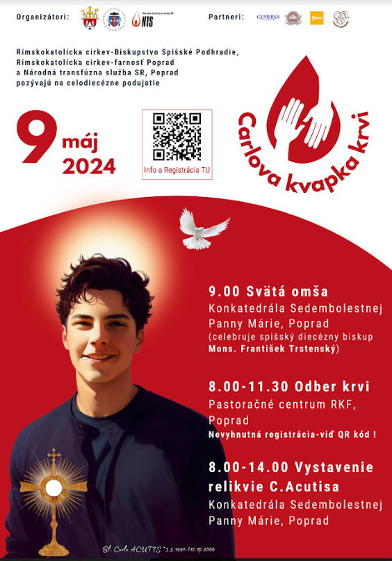 "Biskupstvo Spišské Podhradie pozýva skúsených, no najmä prvodarcov krvi ako aj širokú verejnosť z celej diecézy na podujatie pod názvom CARLOVA KVAPKA KRVI pri príležitosti 33. výročia narodenia bl. Carla ACUTISA – prvého mileniála, ktorý bol vyhlásený za blahoslaveného.
